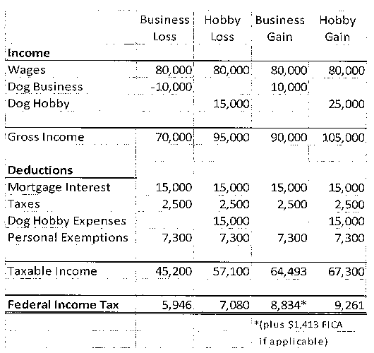 To see the tax impact of the business vs. hobby discussion, consider a hypothetical scenario of a married couple with $80,000 of combined wages and a dog breeding operation. To see the effect in a loss year, assume $15,000 of dog sales and $25,000 of dog expenses (including depreciation). In a profitable year, assume $25,000 of sales and $15,000 of expenses. As you can see, the hobby operation generates more income tax in both scenarios. Note, however, that in many cases a business profit is also subject to Self-Employment tax (FICA), so plan carefully.